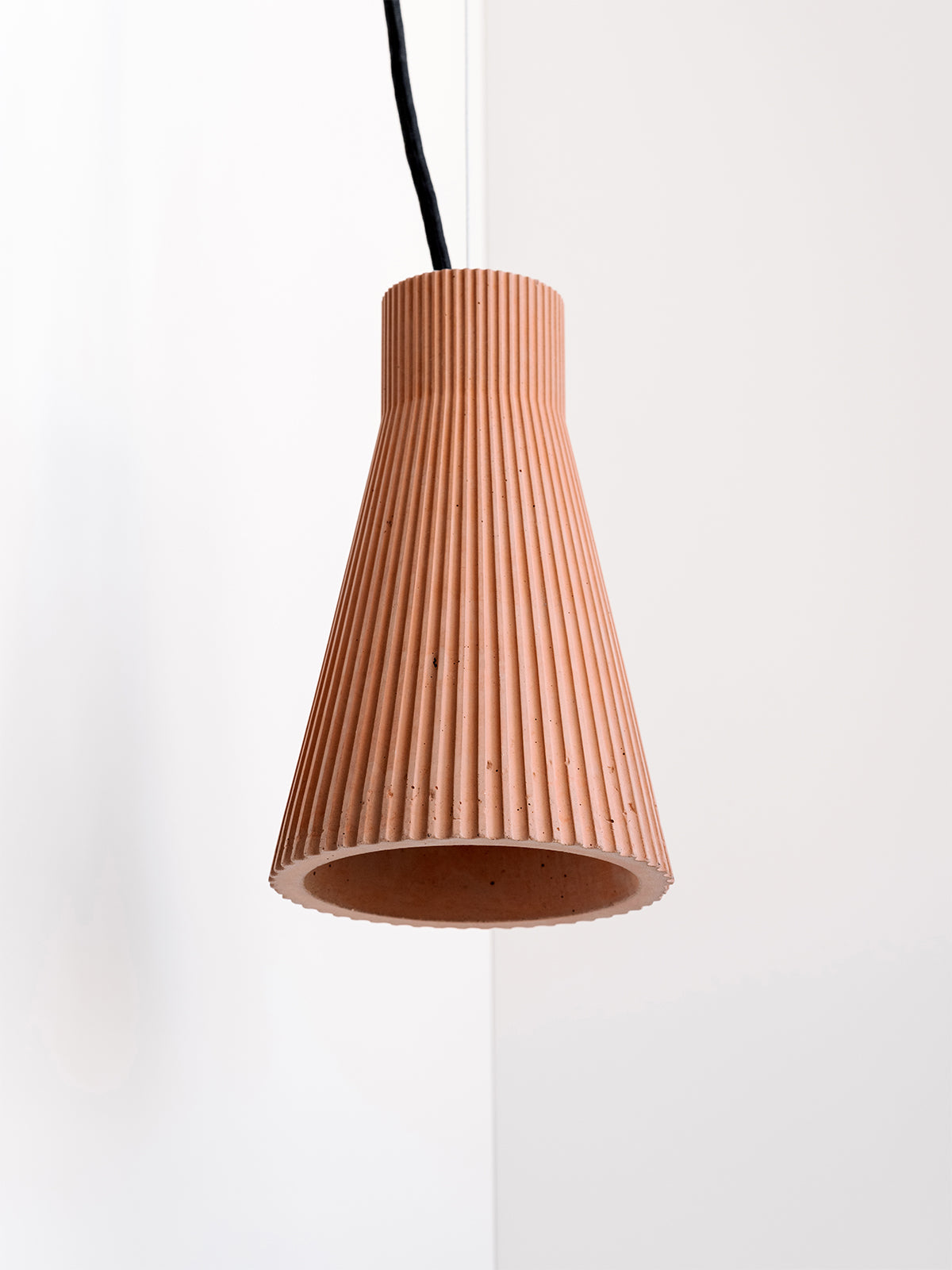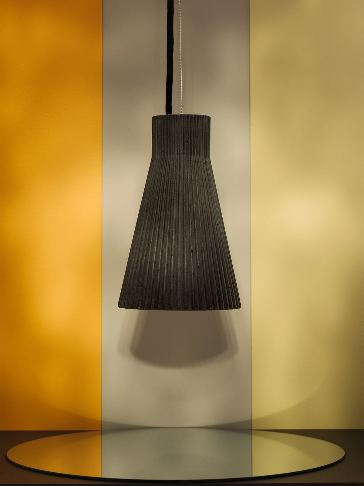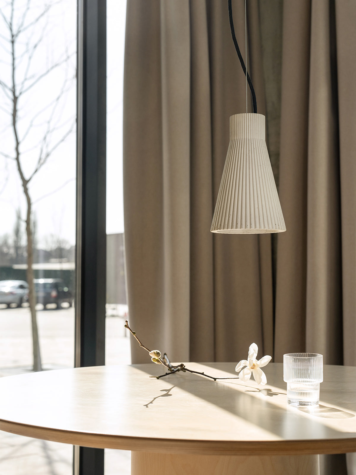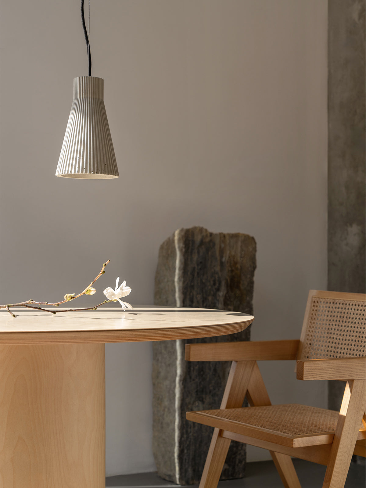 The GANTlights S1 pendant lamp introduces the new S-series aesthetic: a fluted concrete shade that plays with light and shadow, crafted in Berlin. Ideal above a dining table or in a cluster, the S1 blends elegance and texture.
