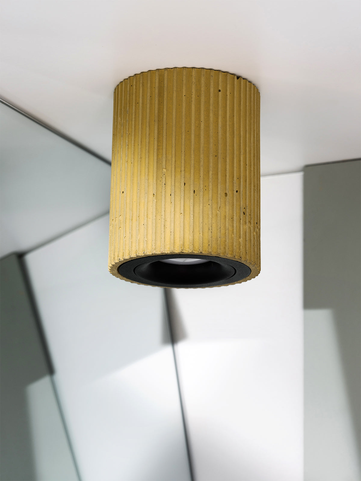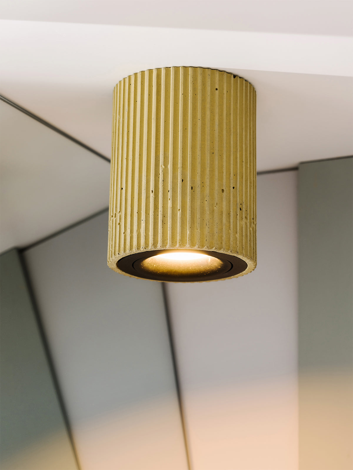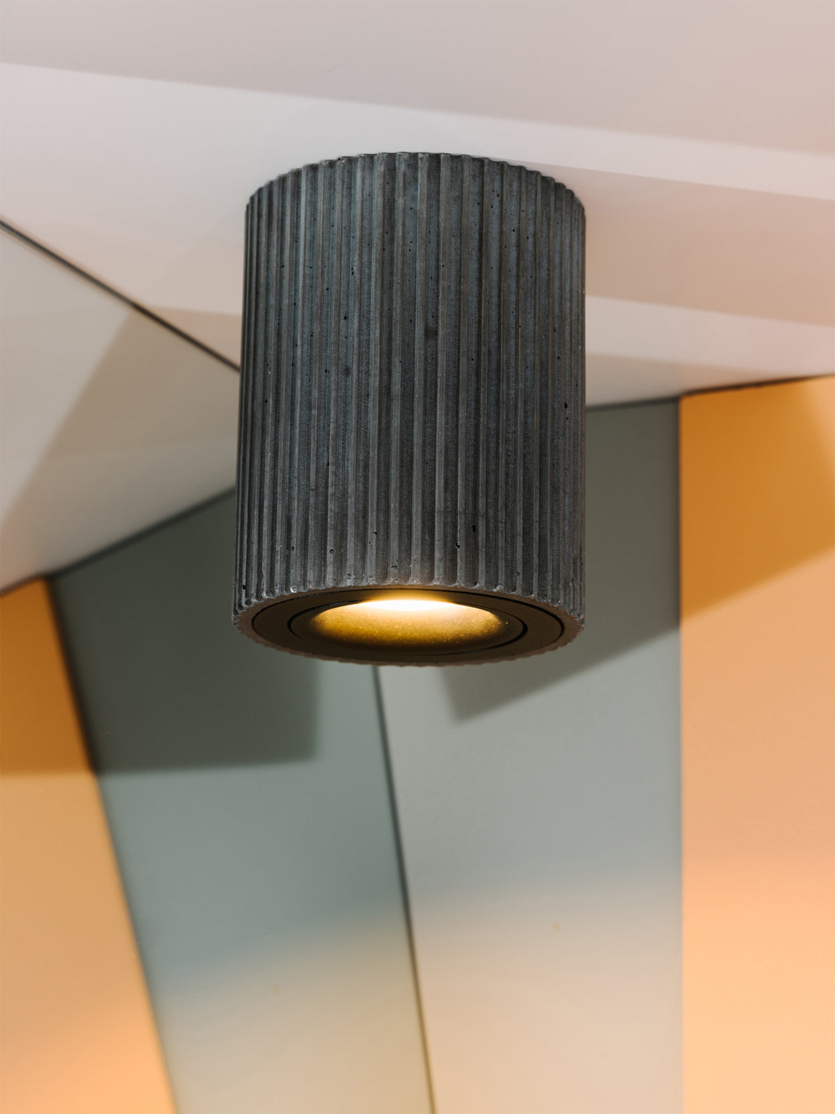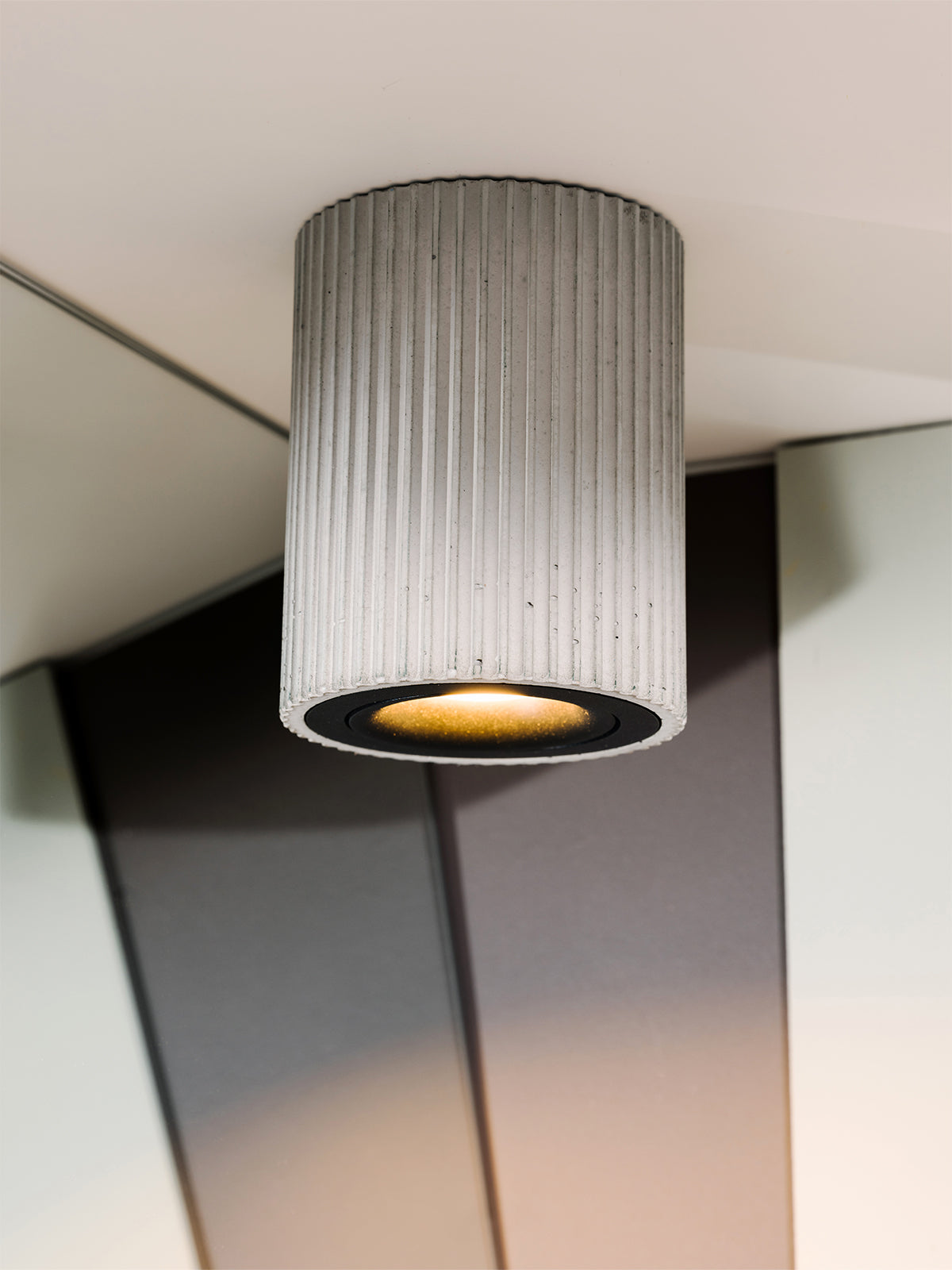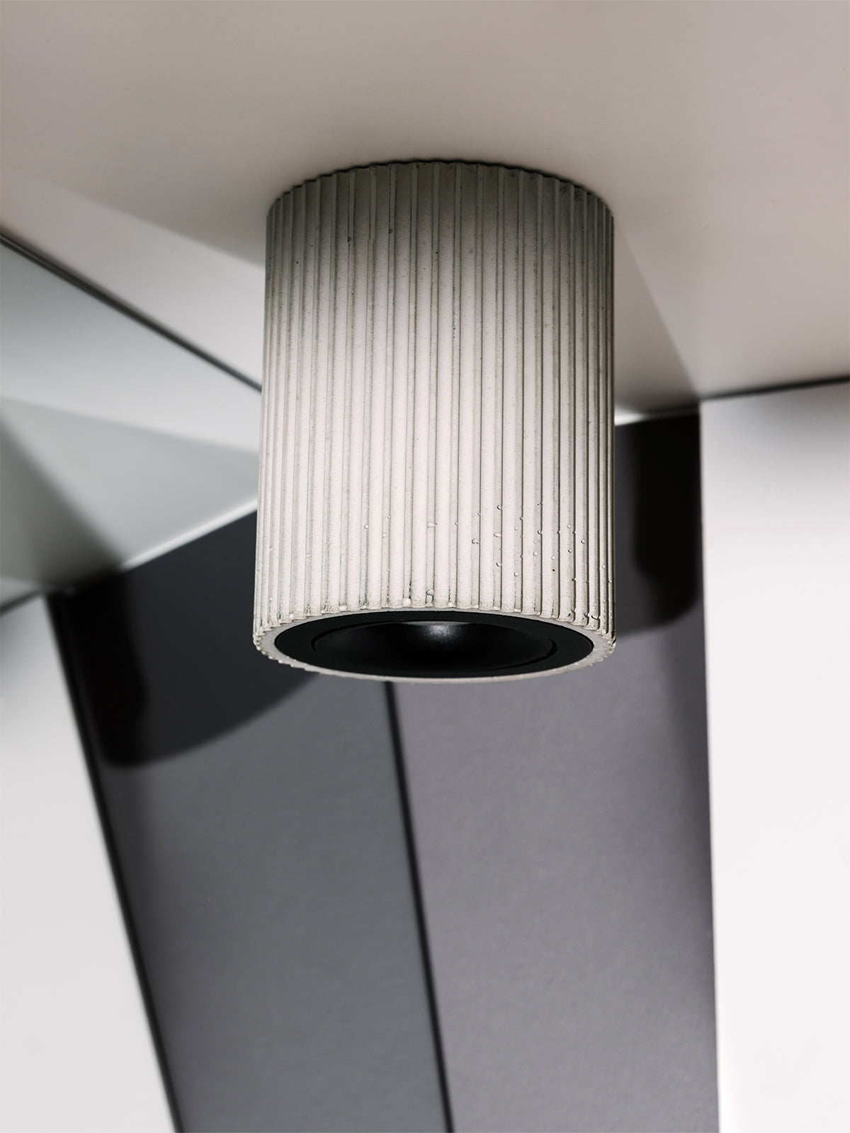 The GANTlights S2 ceiling spot features the S-series signature fluted concrete design in a compact ceiling-mounted form. The textured finish creates a subtle architectural statement — perfect for corridors, entryways or as accent lighting.