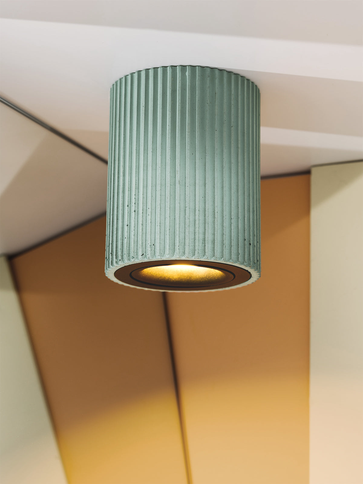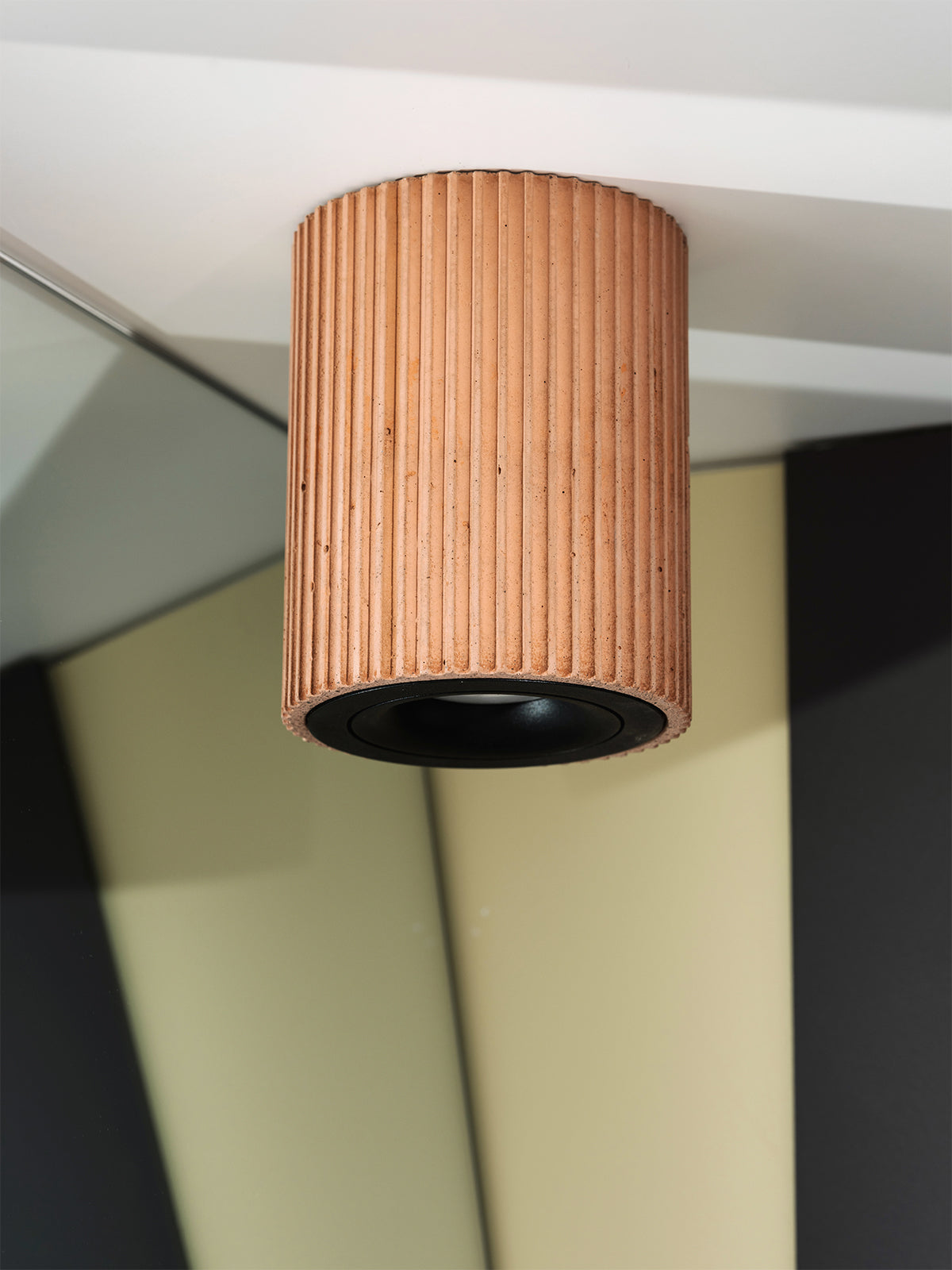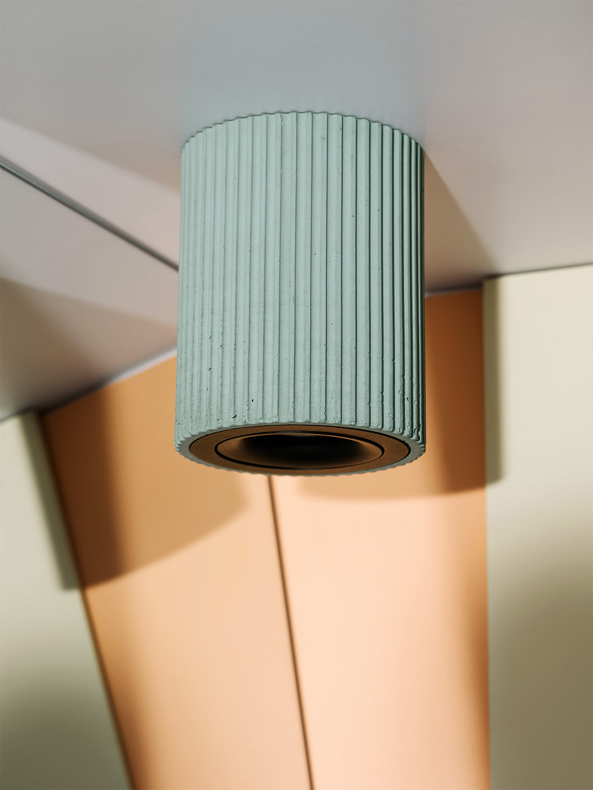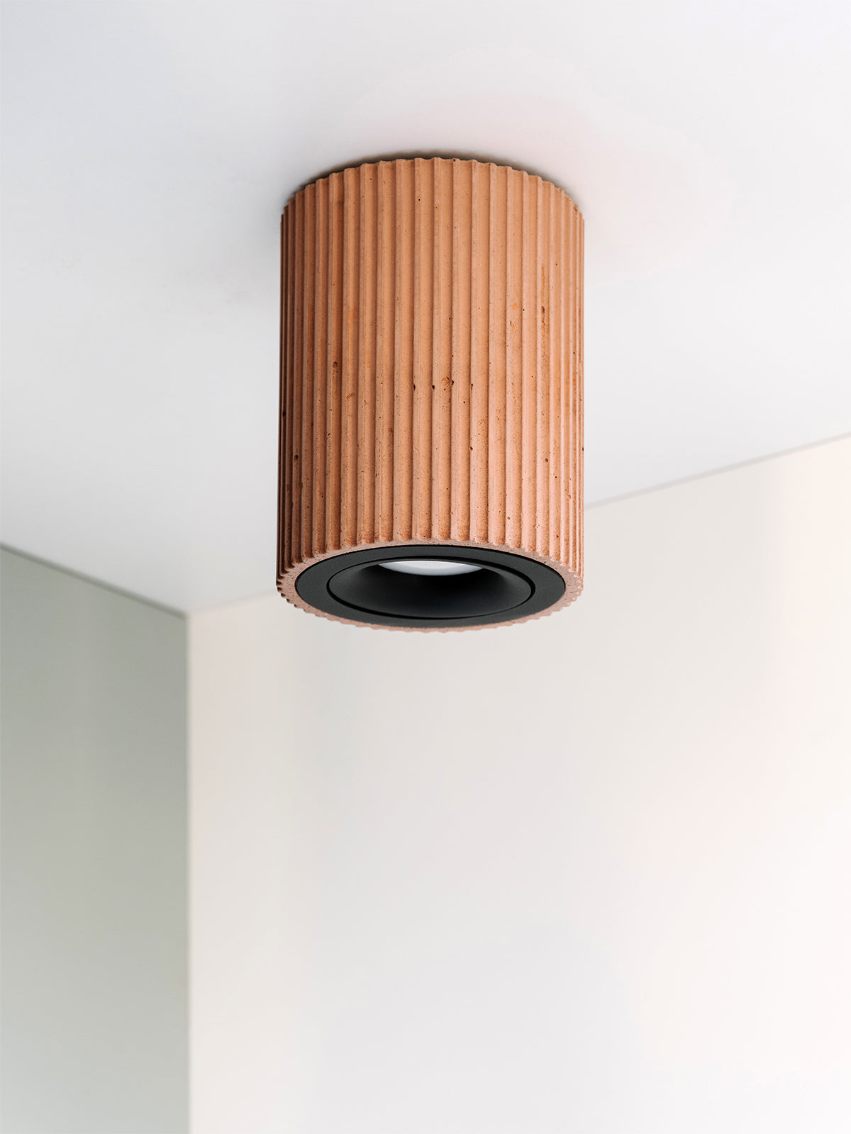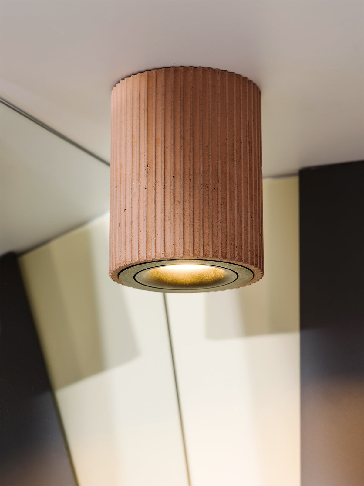 The GANTlights S2 ceiling spot features the S-series signature fluted concrete design in a compact ceiling-mounted form. The textured finish creates a subtle architectural statement — perfect for corridors, entryways or as accent lighting.