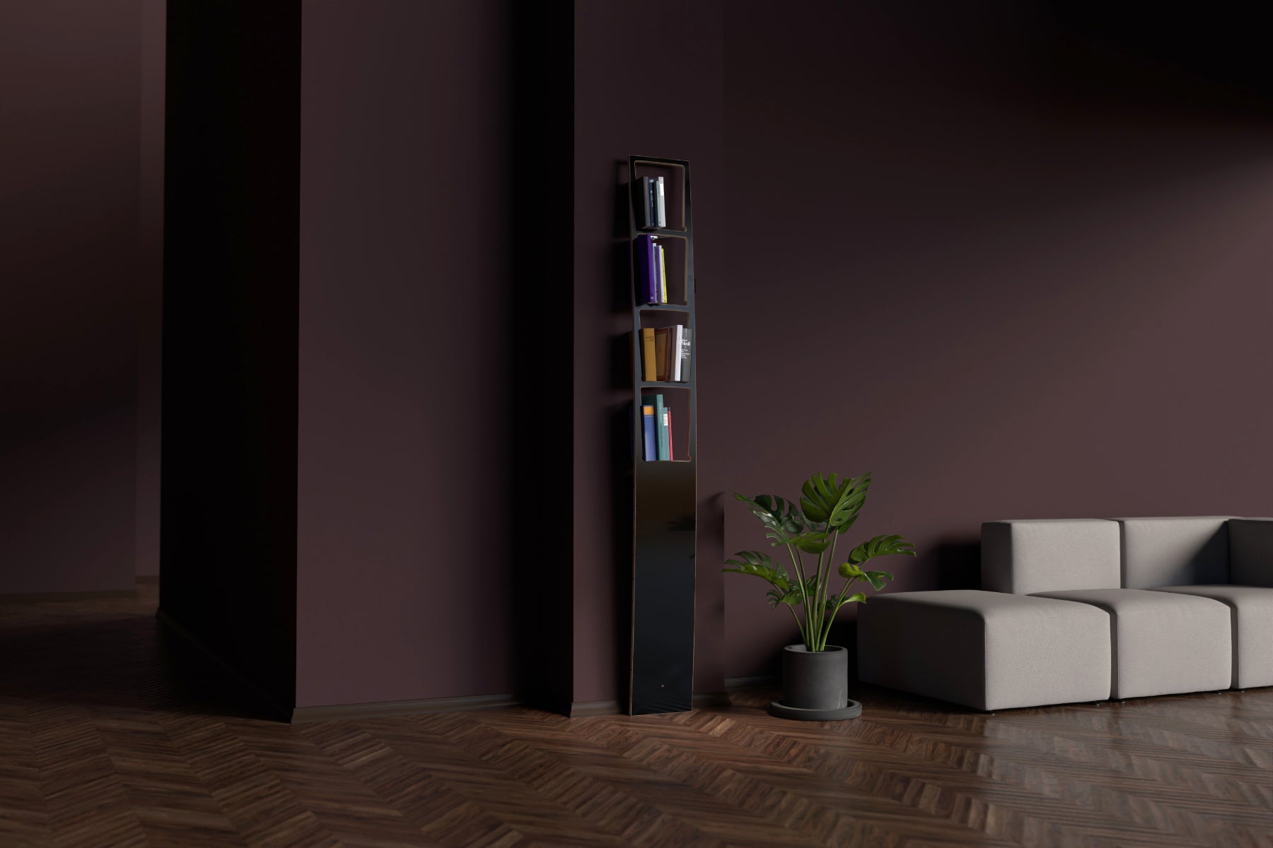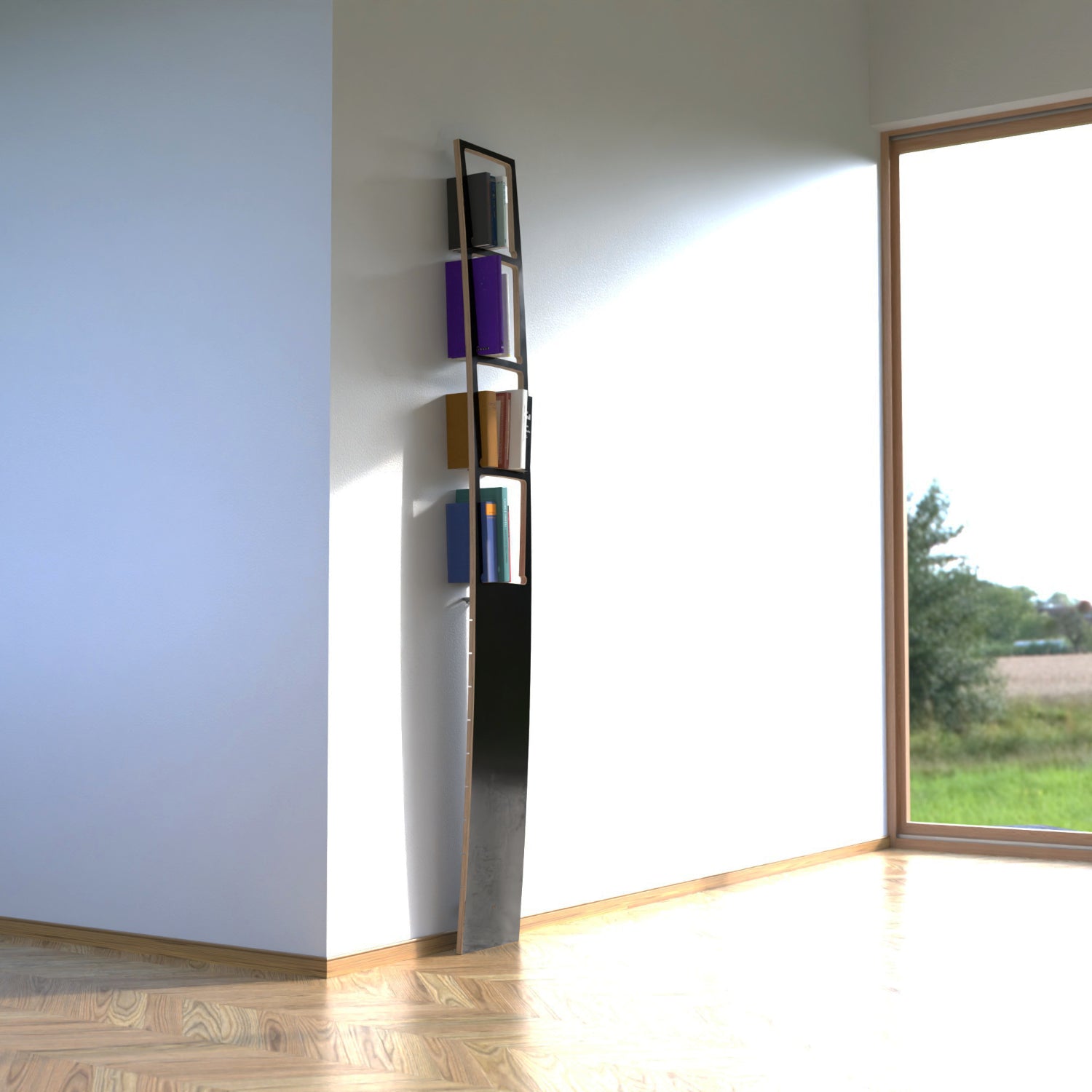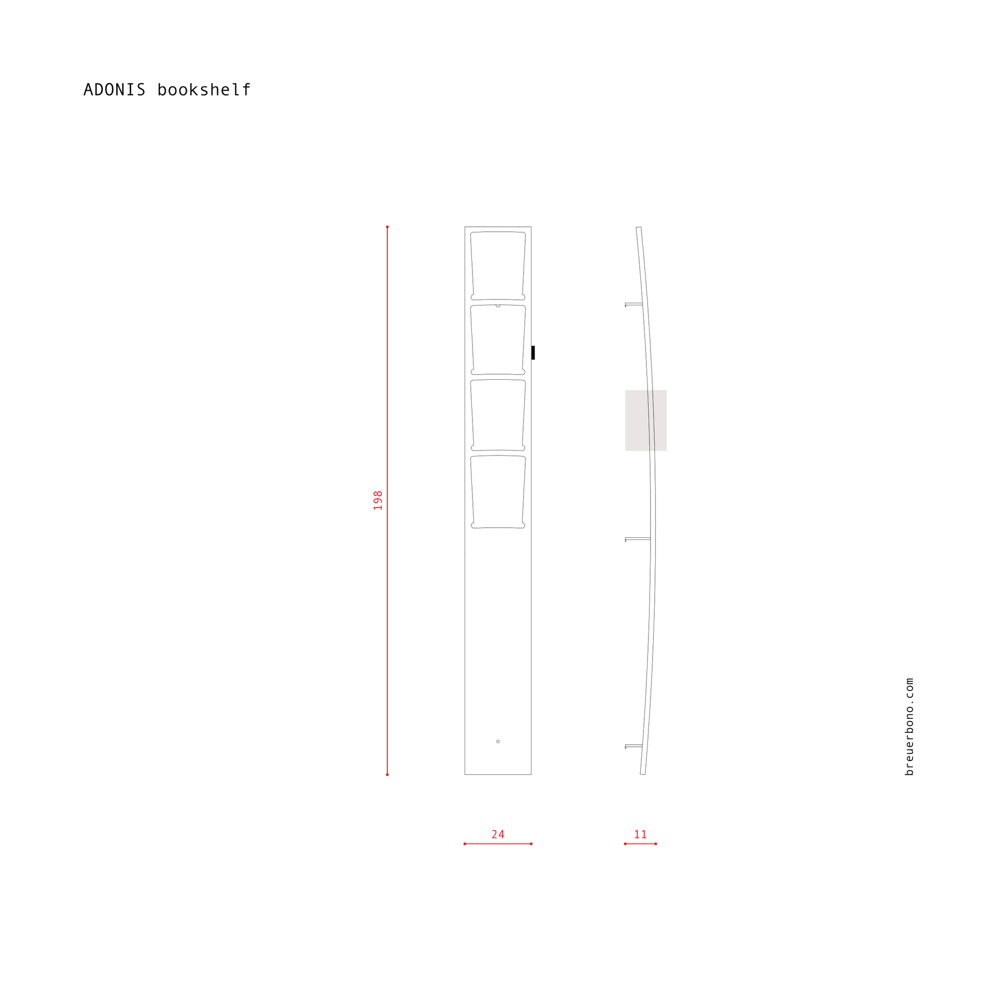 - Typology: vertical board bookshelf; books stand on an edge.