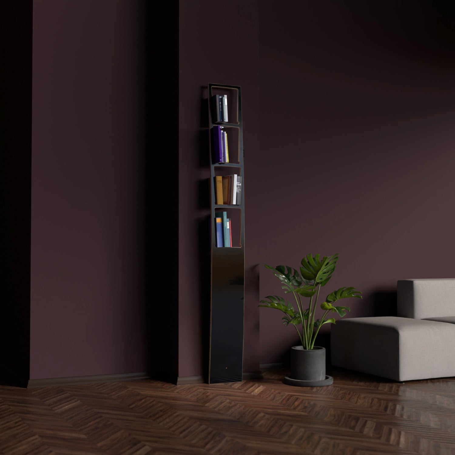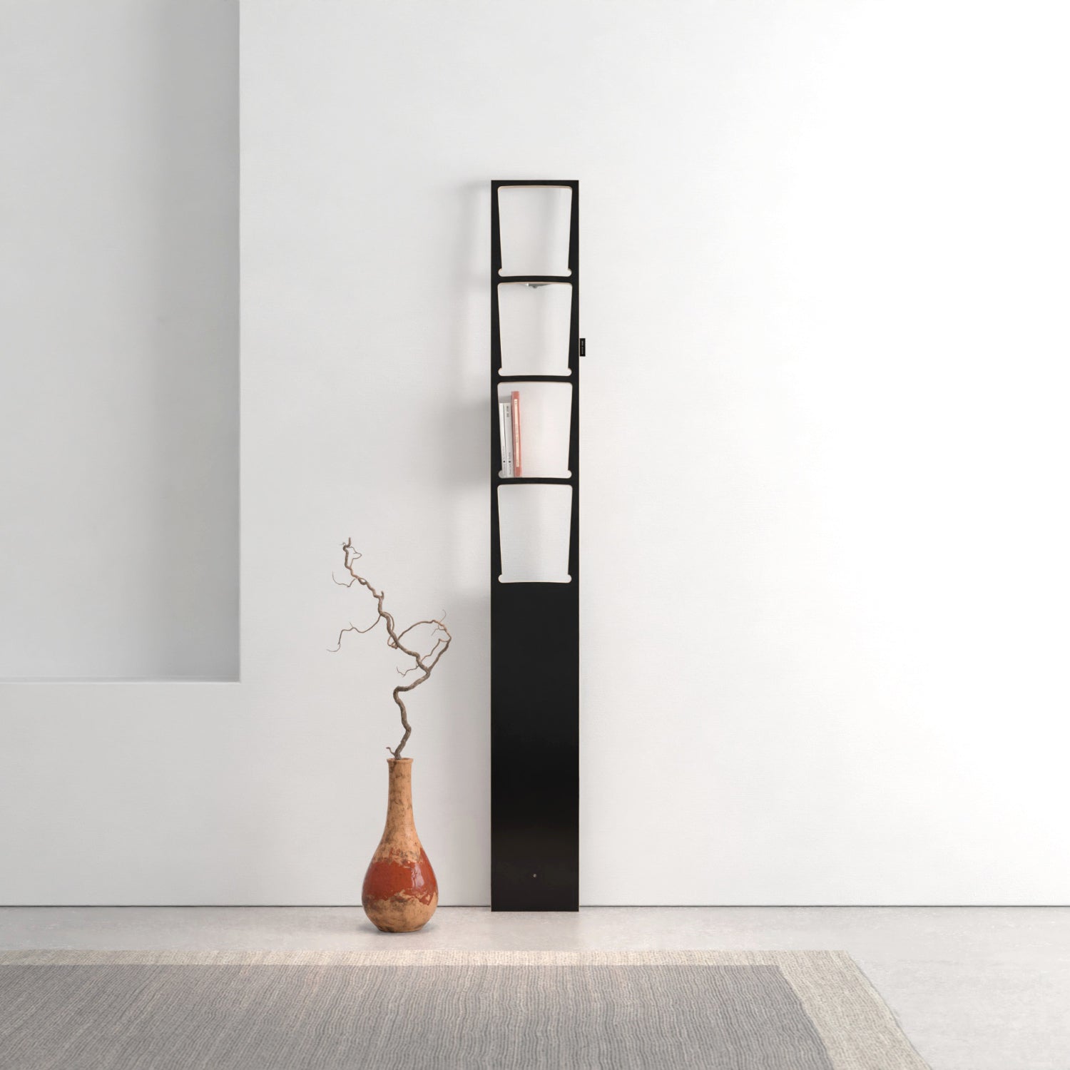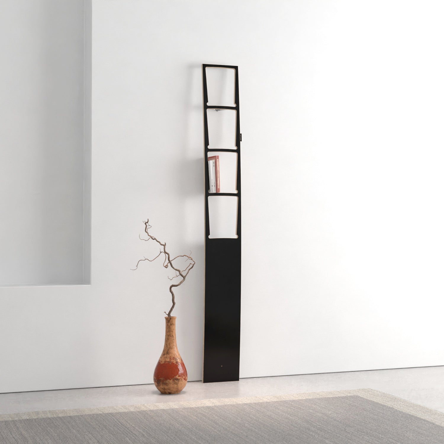 A vertical board bookshelf: instead of placing books on a horizontal shelf, you slide them into a slim vertical frame. A clever, space?saving way to show your favorite titles.