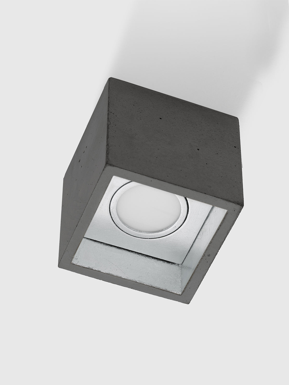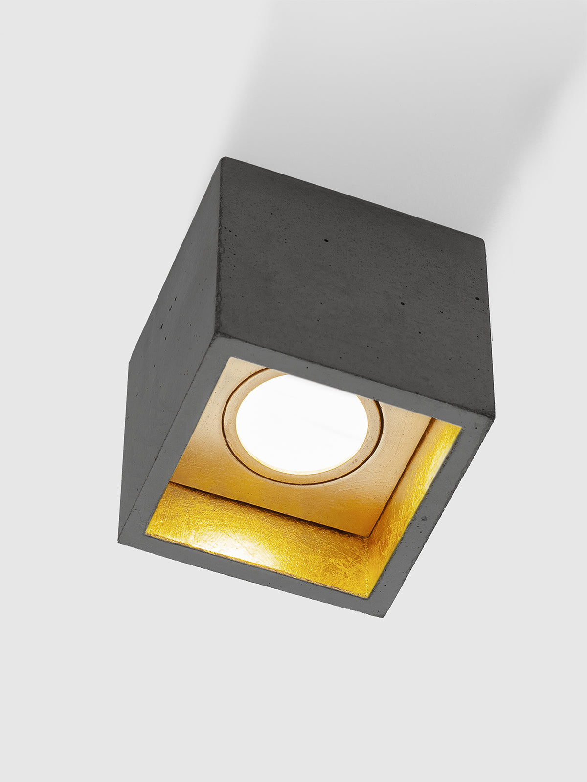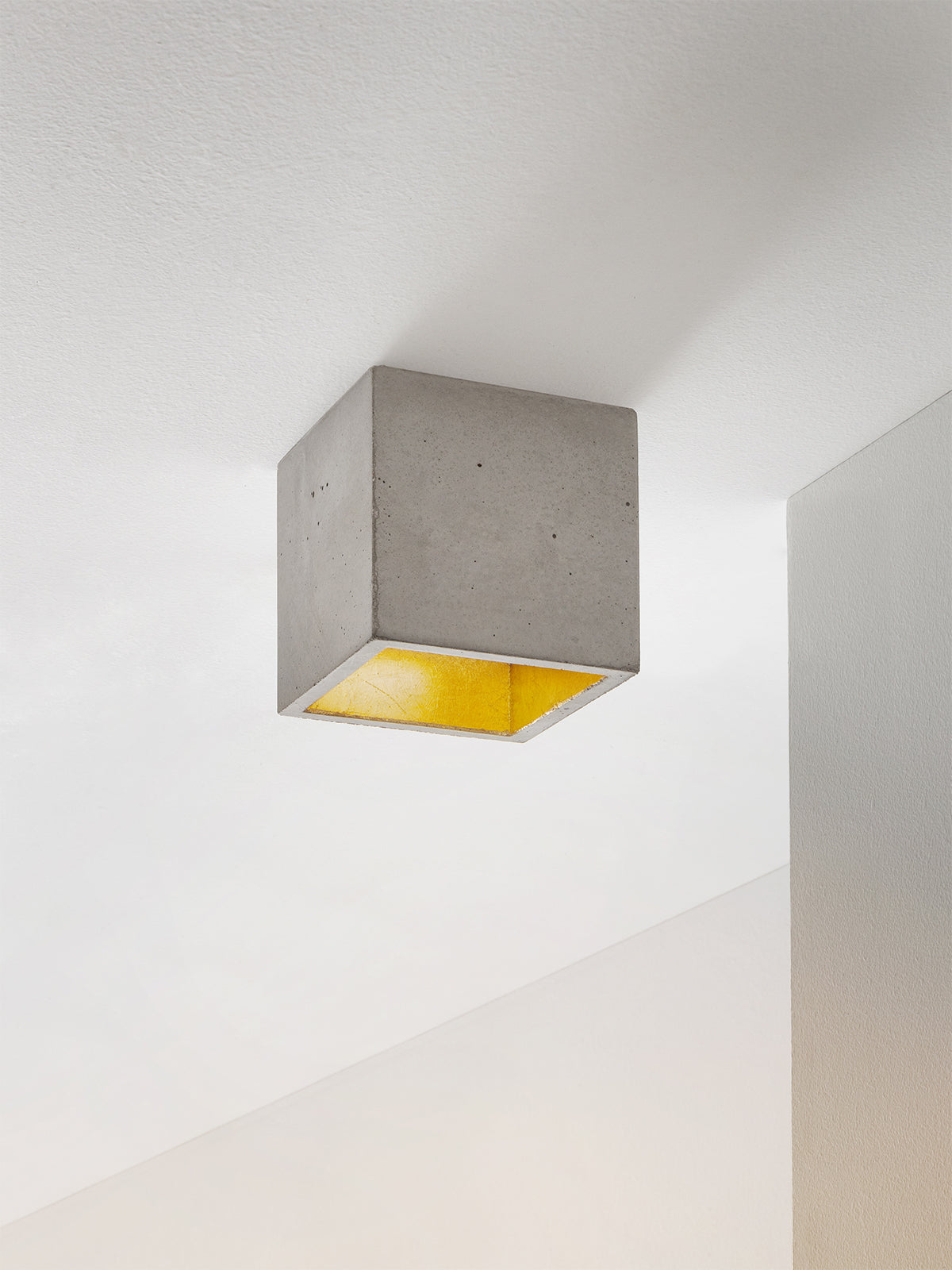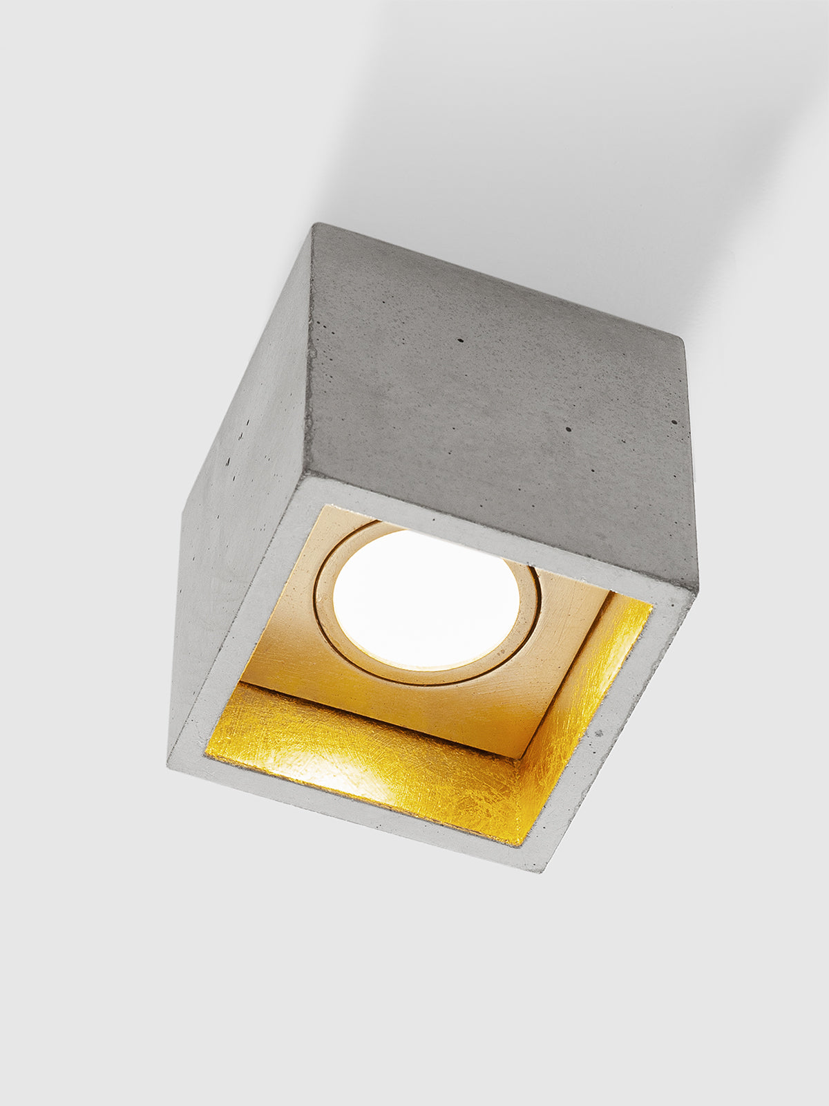 The GANTlights B7 ceiling spot presents the brand’s signature concrete cube (10 × 10 × 10 cm) in a direct mounted form. Handmade in Berlin with metallic interior finishes (gold, copper, silver), it offers a refined spotlight effect — perfect for corridors, entrances or clustered arrangements. :contentReference[oaicite:4]{index=4}