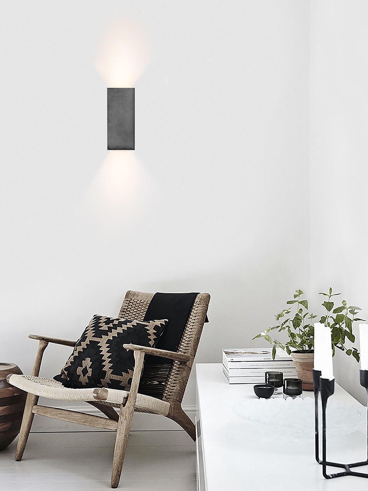 The GANTlights B8 wall light in rectangular form brings the high-contrast concrete design aesthetic of the B-series into a wall-mounted application. With dimensions (10 × 10 × 23 cm) and GU10 dual mount, it is designed for subtle accent lighting along corridors or feature walls. :contentReference[oaicite:6]{index=6}