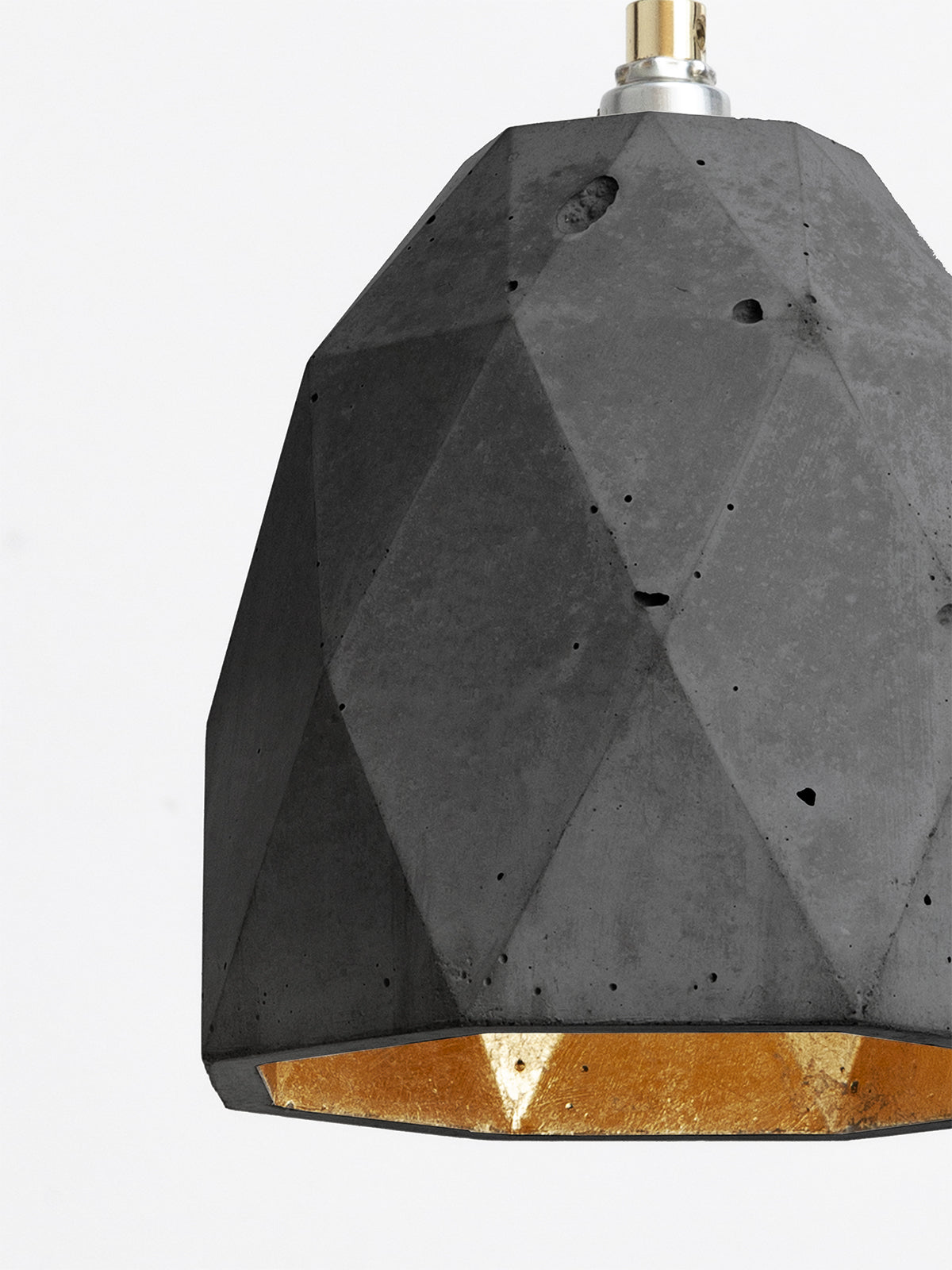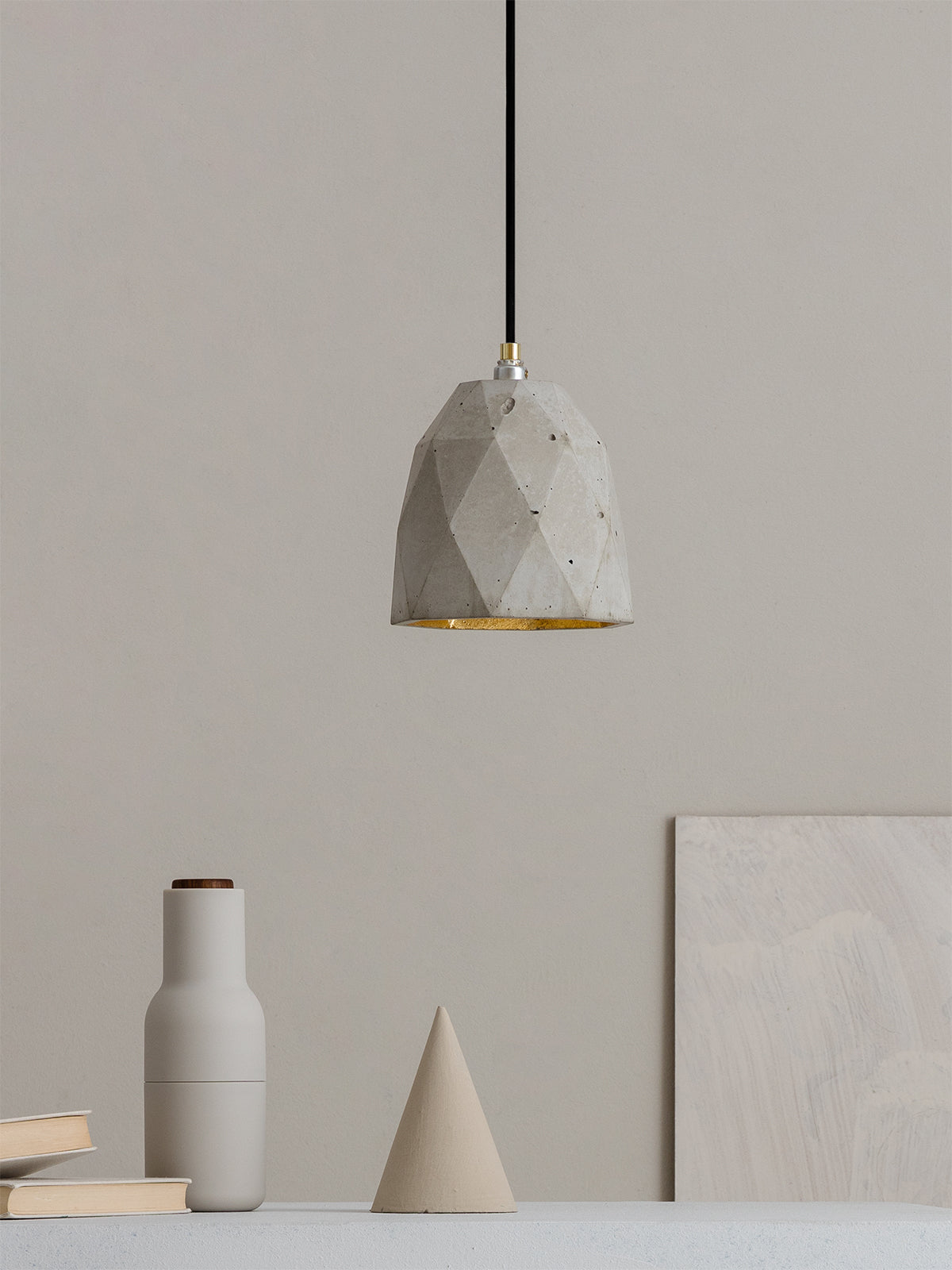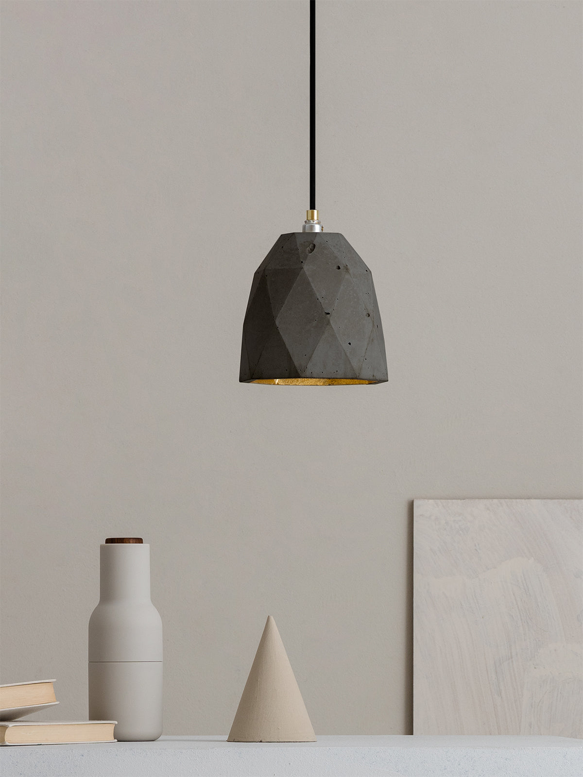 The GANTlights T1 pendant combines raw concrete with refined metallic interior finishes – gold, silver or copper. With its 15 × 15 × 15 cm dimensions it acts as an expressive sculptural piece in modern interiors.