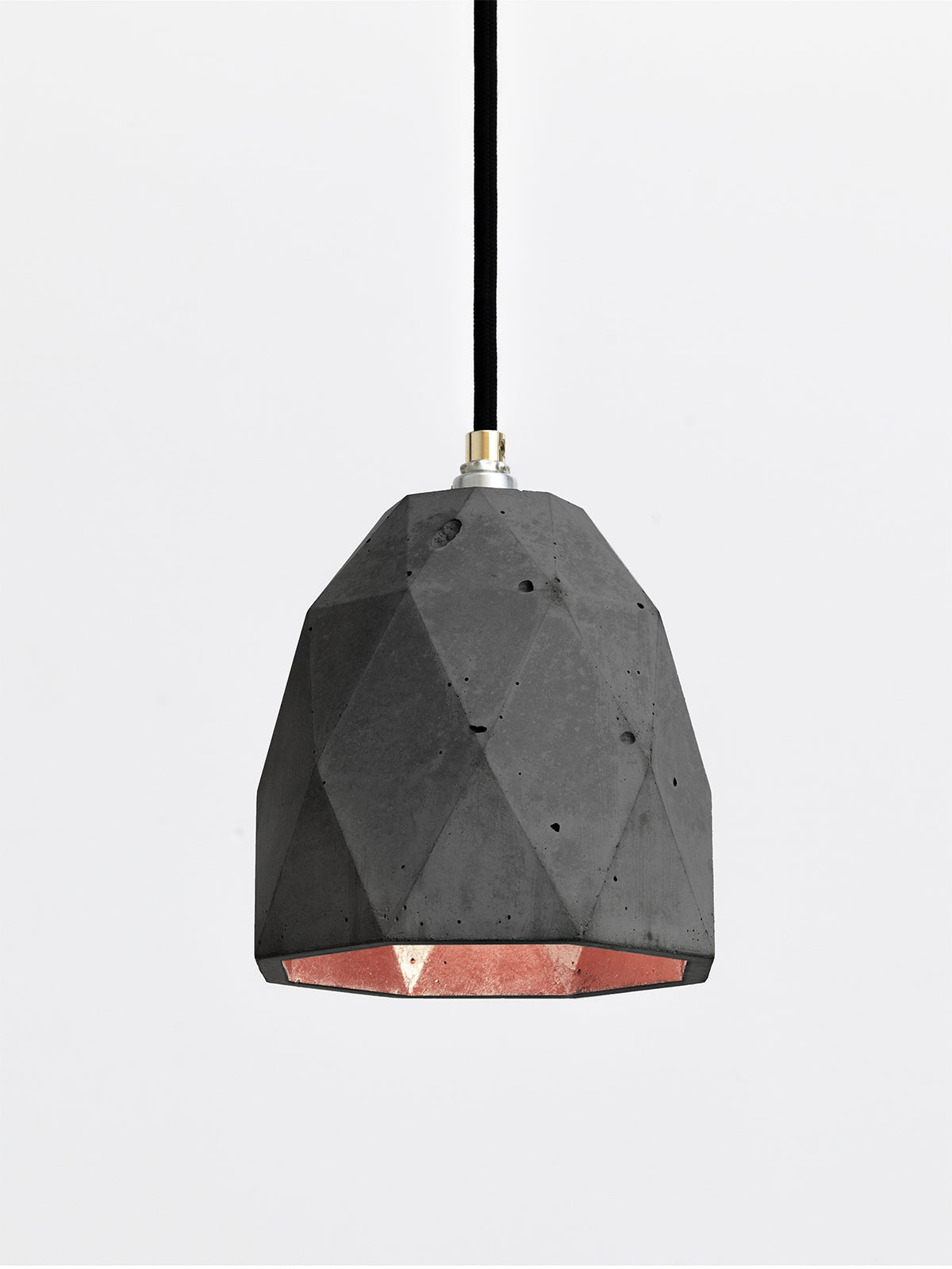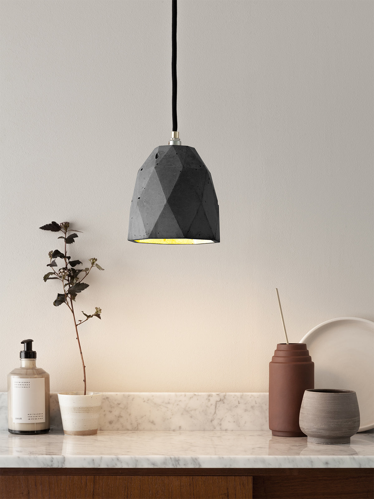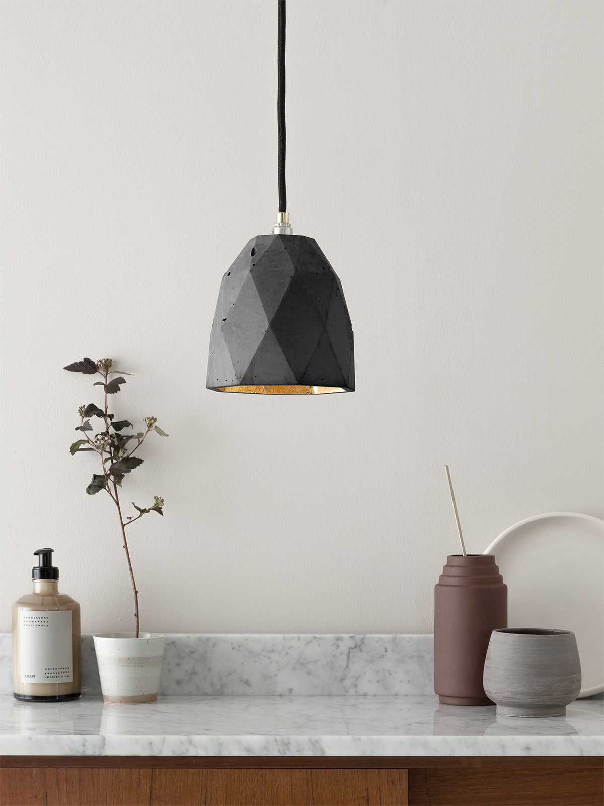 The GANTlights T1 pendant combines raw concrete with refined metallic interior finishes – gold, silver or copper. With its 15 × 15 × 15 cm dimensions it acts as an expressive sculptural piece in modern interiors.
