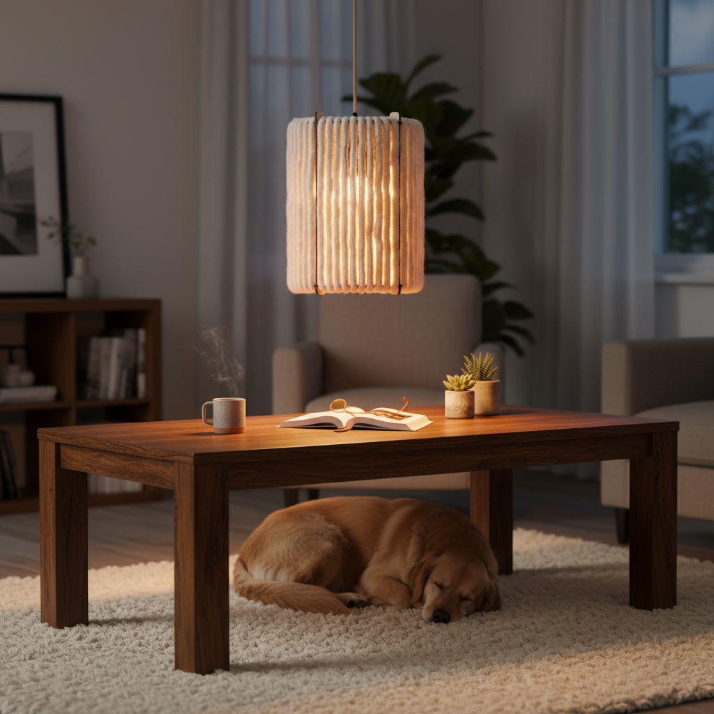 From the 6020 collection and handmade in the Alps (Innsbruck, Tyrol), this pendant combines a solid oak canopy, a 2 m jute cable and a shade made from 100% virgin wool sourced from Tyrolean mountain & stone sheep (Ötztal). Natural materials for warm, diffuse light and a calmer acoustic ambience.